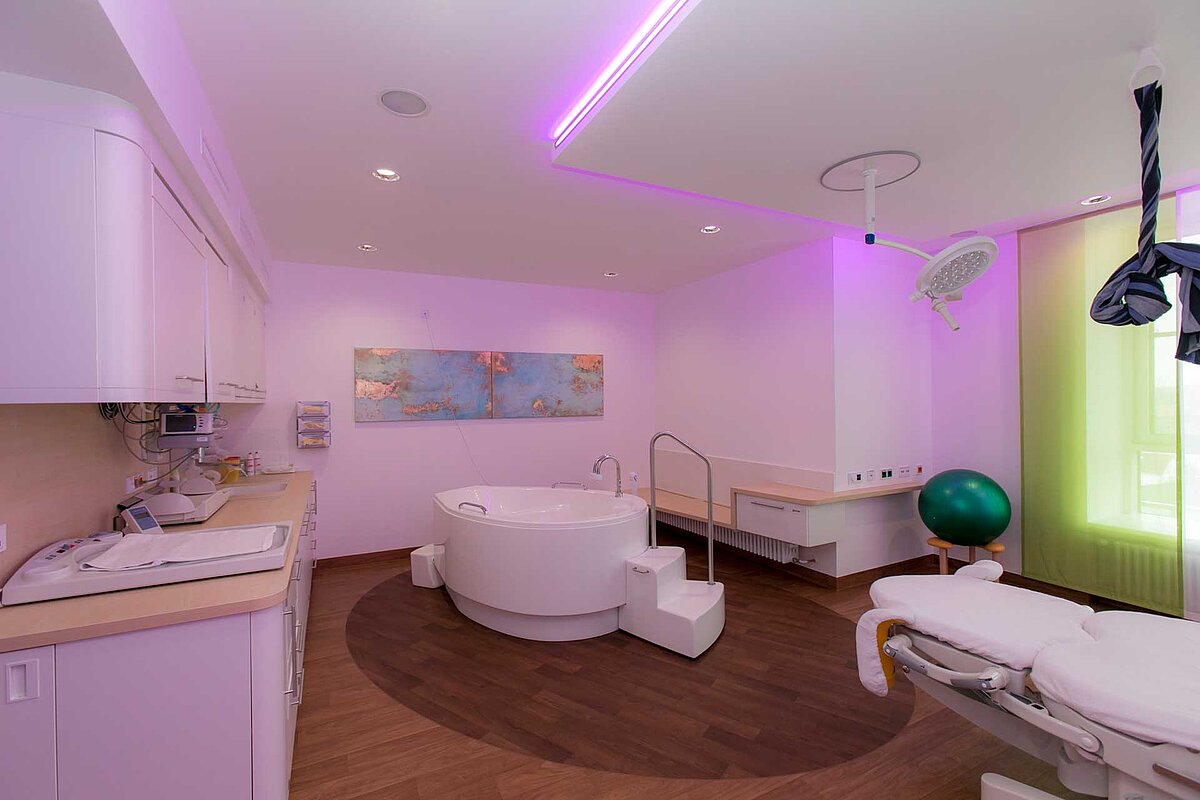 Unser Kreißsaal bietet sechs großzügig gestaltete Entbindungsräume mit modernen Kreißsaalbetten und vielen weiteren Hilfsmitteln wie Gebärhocker, Pezzi-Ball, Lagerungselementen, Sprossenwand und Seil. Somit können verschiedene, individuelle Gebärpositionen, wie beispielsweise im Vierfüßlerstand, in der Seitenlage oder in der Hocke eingenommen werden. Neben der Möglichkeit eines Entspannungsbades in der Eröffnungsphase gibt es auch die Option einer Wassergeburt. Unser Kreißsaal 5 ist dafür mit einer Gebärwanne ausgestattet. Kreißsaal 6 ist konzeptionell als „bewegter Kreißsaal“ angelegt. Dieser bietet neben Sprossenwand, Gebärseil, Bodenmatte auch verschiedene Schaumstoffelemente, die Sie bei Wehen und Geburt nutzen können, um sich zu entspannen und die Wehen zu verarbeiten.