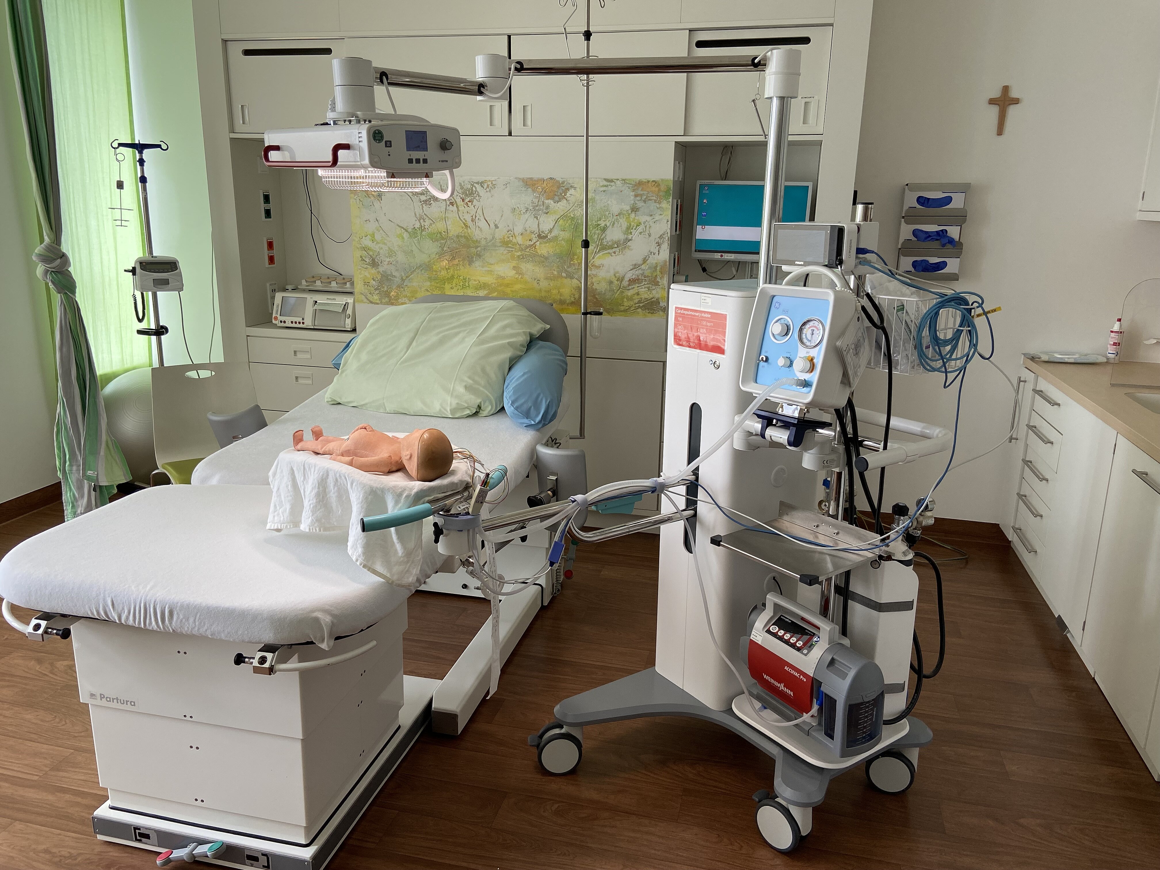 Die körperliche Nähe zur Mutter ist insbesondere bei Frühchen sehr wichtig. Das Josefinum setzt daher auf innovative Technik und ein familienfreundliches Konzept. Eine echte Errungenschaft bei der Versorgung von extrem Frühgeborenen unter 1.500 Gramm ist der sogenannte „Concord Birth Trolley“ (con cord = mit Nabelschnur), der deutschlandweit nur in wenigen Kliniken zum Einsatz kommt. „Nach dem Abnabeln, also dem Durchtrennen der Nabelschnur, muss sich das Neugeborene selbst versorgen. Bei extrem Frühgeborenen kann dies problematisch sein. Durch den Birth Trolley können wir auch extreme Frühchen unter 1.000 Gramm unmittelbar nach der Geburt umfassend medizinisch versorgen und stabilisieren, während sie noch über die Nabelschnur mit der Mutter verbunden sind. Erst wenn sich das Kind ausreichend stabilisiert hat, folgt das Abnabeln“, macht Dr. Roman Steierl, Chefarzt der Frauenklinik der KJF Klinik Josefinum, die Vorteile des Gerätes deutlich.